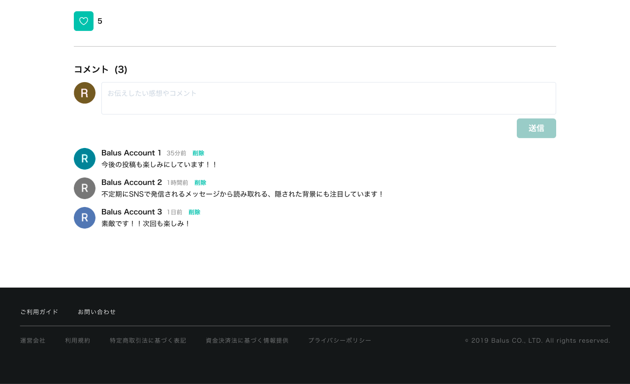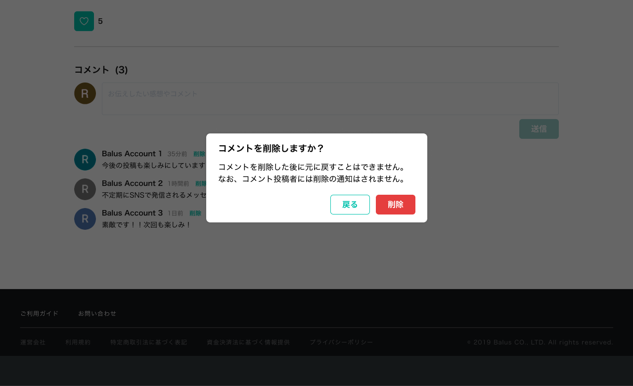 いいね・コメントを削除したい 2024年01月17日 08:02 更新 ・いいねの削除について 運営側での削除や解除はできかねます。 (ユーザーがいいねボタンを再クリックすると、いいねの解除がされます。) ・コメントの削除について コメントしたユーザーによりコメント表示欄の削除ボタンから削除が可能です。