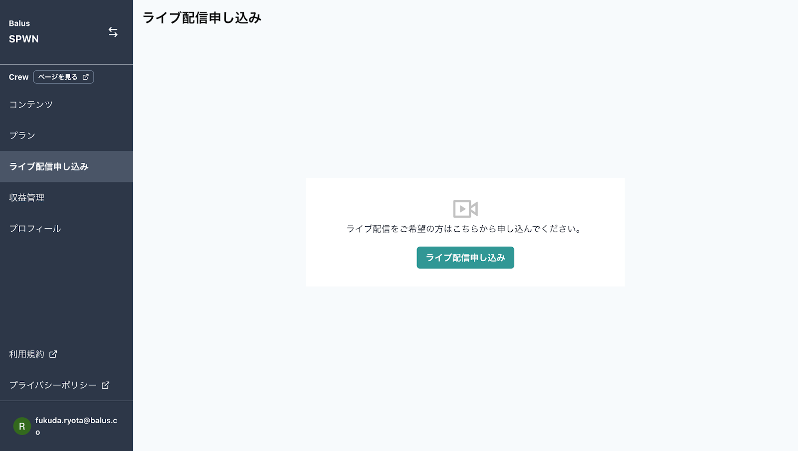 1.ファンクラブのライブ配信申し込み画面より、ライブ配信申し込みをクリックしてください。